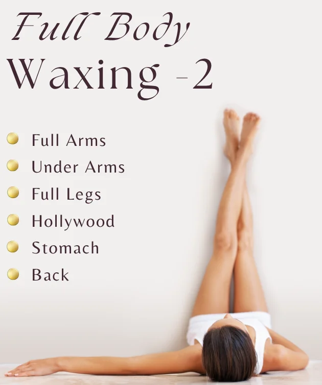 Our **Full Body Waxing 2** service at Navara Beauty is the ultimate in full-body hair removal. This comprehensive service includes **full arms**, **under arms**, **full legs**, **Hollywood waxing**, **stomach**, and **back**. Hollywood waxing removes all hair from the bikini area for a clean, sleek finish, while the full-body treatment ensures you’re completely smooth and polished from head to toe.